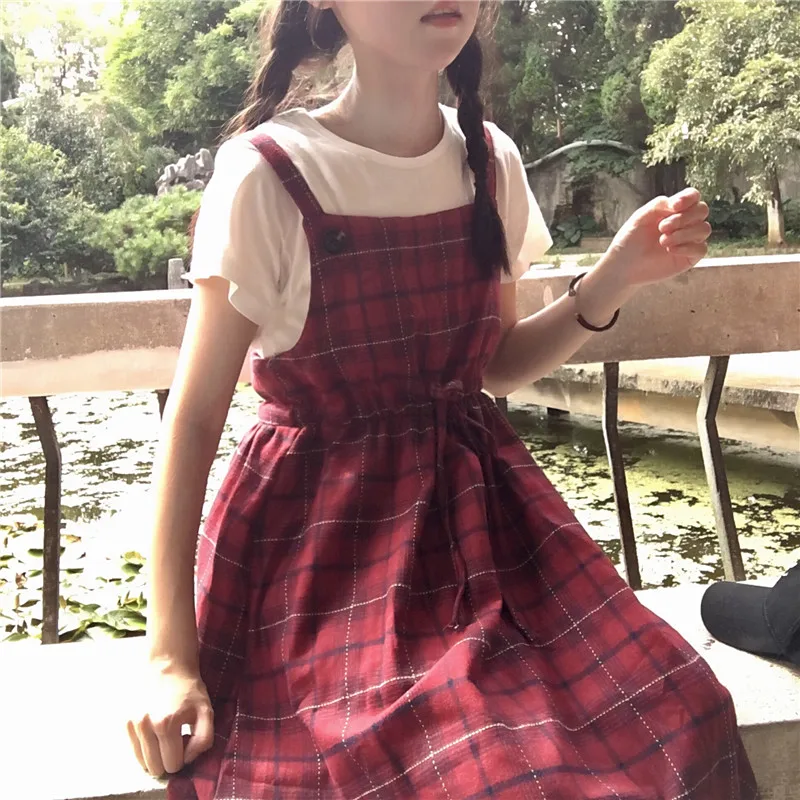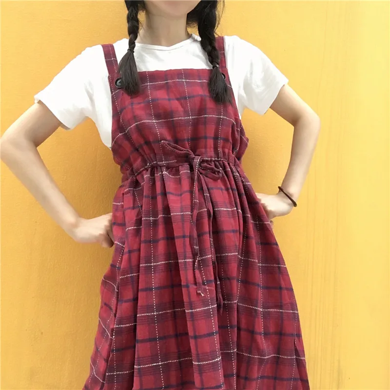 Preppy Style Spring Autumn Women Sundress Suspenders Blue Red Plai