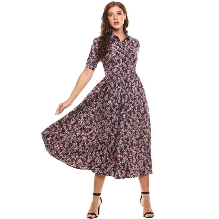 Femme Robe Longue Floral Style Vintage Manches Courtes Impression Rouge Achat Vente Robe Cdiscount
