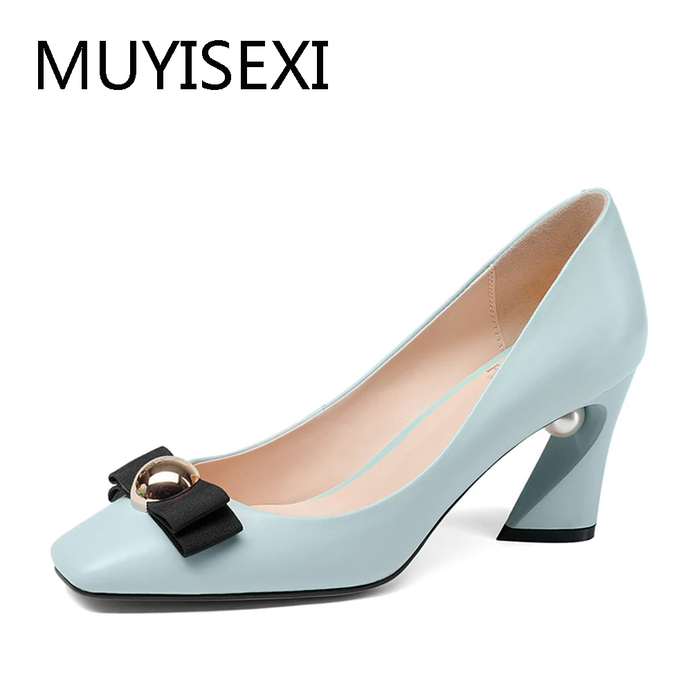 Bleu Bureau Dames Travail Chaussures Arc Femmes Pompes 7 5 Cm Sabot Talons Hauts Avec Perle En Cuir Veritable Noir Grande Taille Hy04 Muyisexi Aliexpress