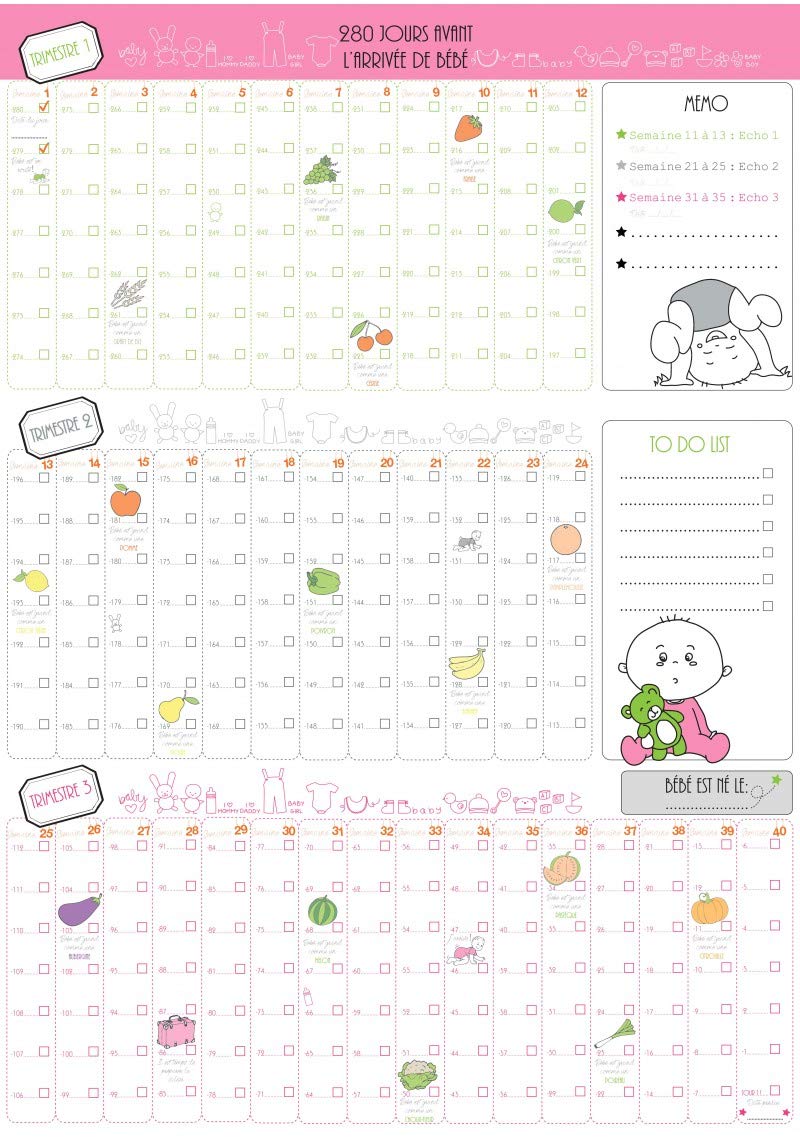 Calendrier de Grossesse Semaine après semaine Découvrez le calendrier de Grossesse semaine après semaine, il vous permettra de calculer votre semaine de grossesse, et vous fournira une multitude d'informations sur les différentes étapes de l'évolution de votre bébé au cours de la grossesse. Calendrier de grossesse les dates clés à planifier Echographies, consultation de suivi de grossesse, prises de sang La grossesse est rythmée par de nombreux rendezvous médicaux, obligatoires ou non Pour s’organiser, rien de tel que de se faire son calendrier de grossesse personnalisé. À quoi sert un calendrier de grossesse ?.
