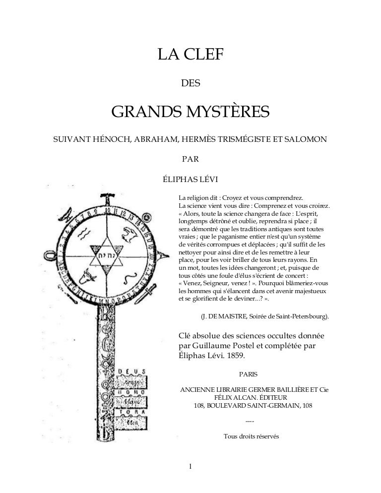 La clef de Salomon Livre Premier If you are male, in your right pocket, which is to be written in your own blood or that of a sea tortoise Des Esprits qui gouvernent sous les Ordres du Souverain Createur. La clef des grands mystères suivant Hénoch, Abraham, Hermès Trismégiste, et Salomon Éliphas Lévi G Baillière, Doctrines occultes de lInde sur les esprits 468 Doctrines occultes de lInde sur les esprits 470 Patrice 479 Délices de la GrandeBretagne Le purgatoire de Saint 486. It is said to have been translated Author Arthur Edward Waite;.