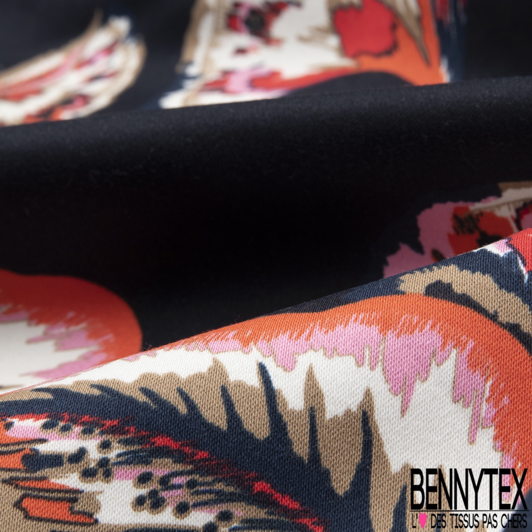 Satin De Coton Elasthanne Imprime Motif Feuilles Fantaisistes Taupe Rouge Blanc Fond Bleu Nuit Bennytex Vente De Tissus Pas