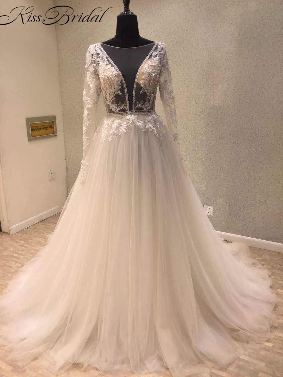 Nouveau Elegant A Ligne Robes De Mariee Tulle Dos Nu Illusion Decollete A Manches Longues Robes De Mariee Chapelle Train Robe Mariee Aliexpress