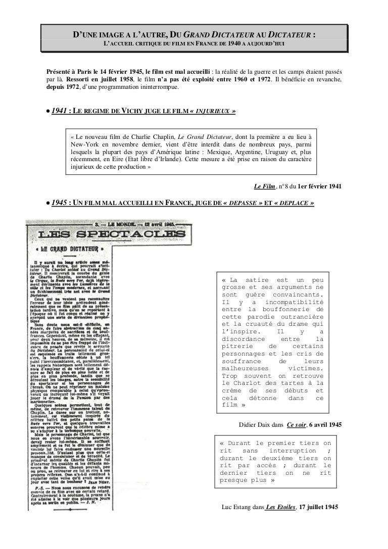 Article de JeanPierre Py Le Dictateur est véritablement une oeuvre de maturité né en 18 (exactement comme Hitler), Charlie Chaplin avait 49 ans en 1938, dont déjà 25 ans d’expérience au cinéma depuis le Charlot de la Keystone (), et s’apprêtait à réaliser l’un de ses trois plus grands films Chaplin venait du cinéma muet et n’avait pas encore complètement. Européennes Dans le monde libre, « Le dictateur » fut un grand succès populaire, notamment en Angleterre ANALYSE « PLASTIQUE » DU FILM * C’est un film en noir et blanc, réalisé dans des décors de studios, avec un éclairage totalement artificiel (il y a plusieurs ombres), que l’on peut voir sur les images présentées. Grand maître du cinéma muet décédé il y a 43 ans, « Le Dictateur » de Charlie Chaplin marque l'apogée de la carrière de l'acteur Retour sur les anecdotes qui entourent ce film.