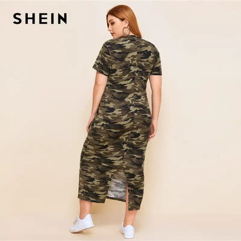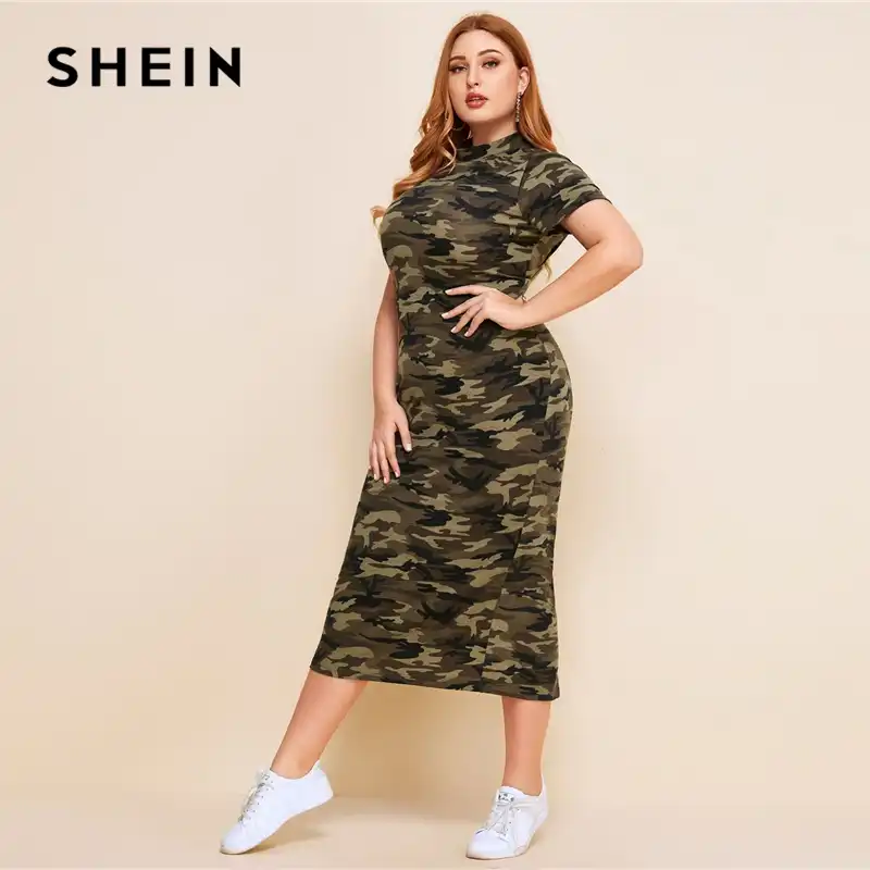 Shein Grande Taille Fendu Dos Camouflage Imprimer Robe Moulante Femmes Ete Col Montant Manches Courtes Decontracte Ajuste Longues Robes Aliexpress