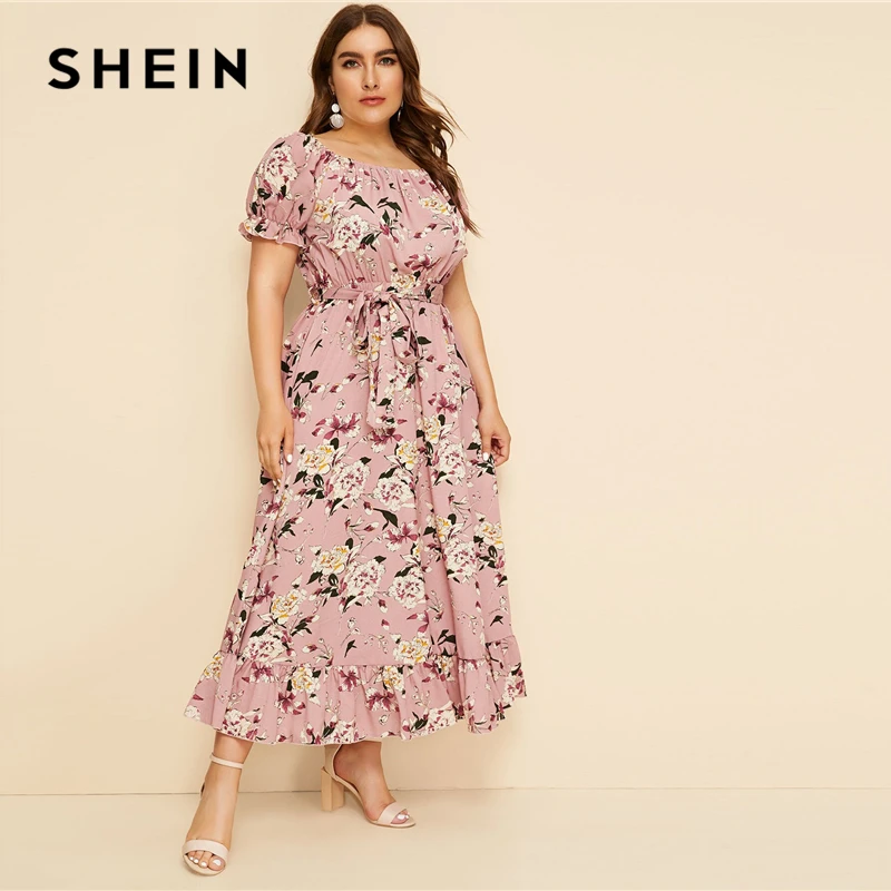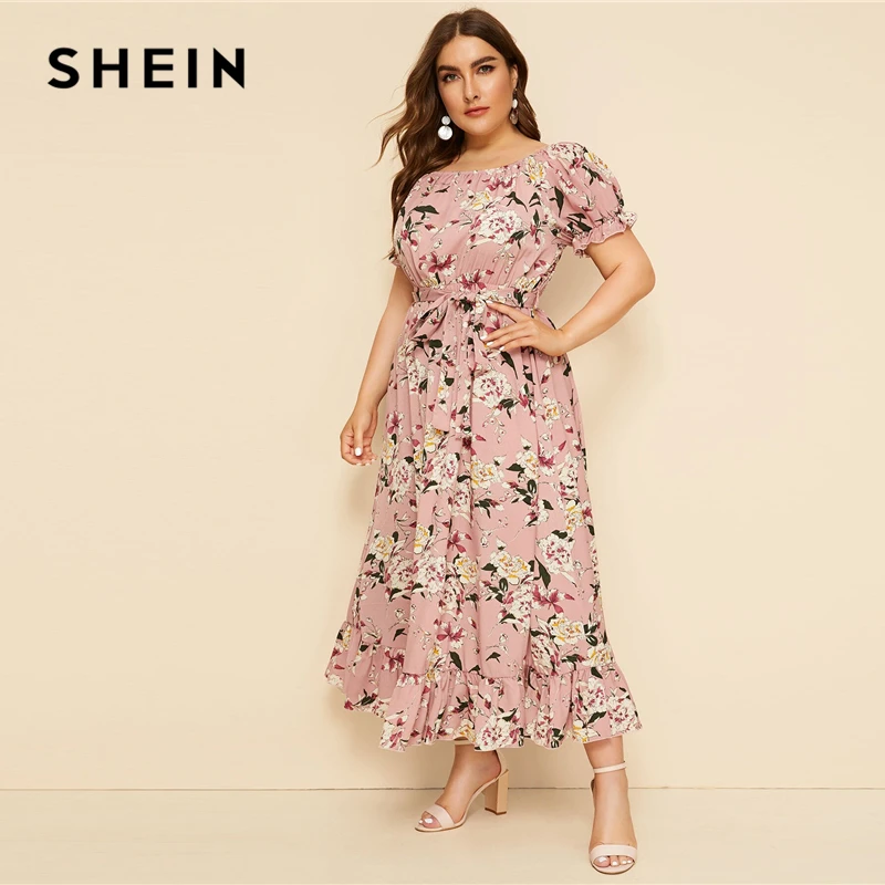 Shein Grande Taille Rose A Volants Ourlet Imprime Floral Ceinture Longue Robe Femmes 19 Ete Automne Bateau Cou Taille Haute Une Ligne Boho Robes Aliexpress