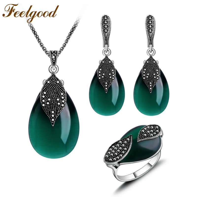 Feelgood Parure De Bijoux Vintage Couleur Argent Mode Goutte D Eau Vert Pierre Naturelle Opale Bijoux Ensembles Pour Femmes Cadeau De Fete Aliexpress