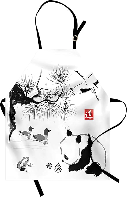 Amazon Com Lunarable Asian Apron Bird Cedar Panda Bear Traditional Japanese Painting Style Art Hieroglyph Way Unisex Kitchen Bib With Adjustable Neck For Cooking Gardening Adult Size White Black Home Kitchen