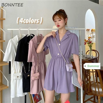 Rompers Women Chic Turn Down Collar Summer Korean High Waist Vintage Femme Playsuits Leisure Button Party Woman Oversize Clothes Leather Bag