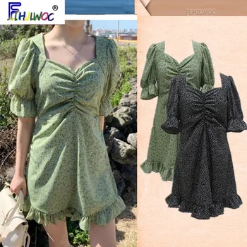 South Korea Chic Dresses Hot Sales Women Flhjlwoc Style Ruffled Fresh Green Floral Print Draped Dress Vintage Vestidos Femme Leather Bag