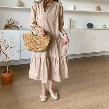 Aiyanga Women Cotton Summer Dress 19 Korean Style Loose Oversize Long Dress Robe Femme Ins Chic Womens Casual Vintage Dress Leather Bag