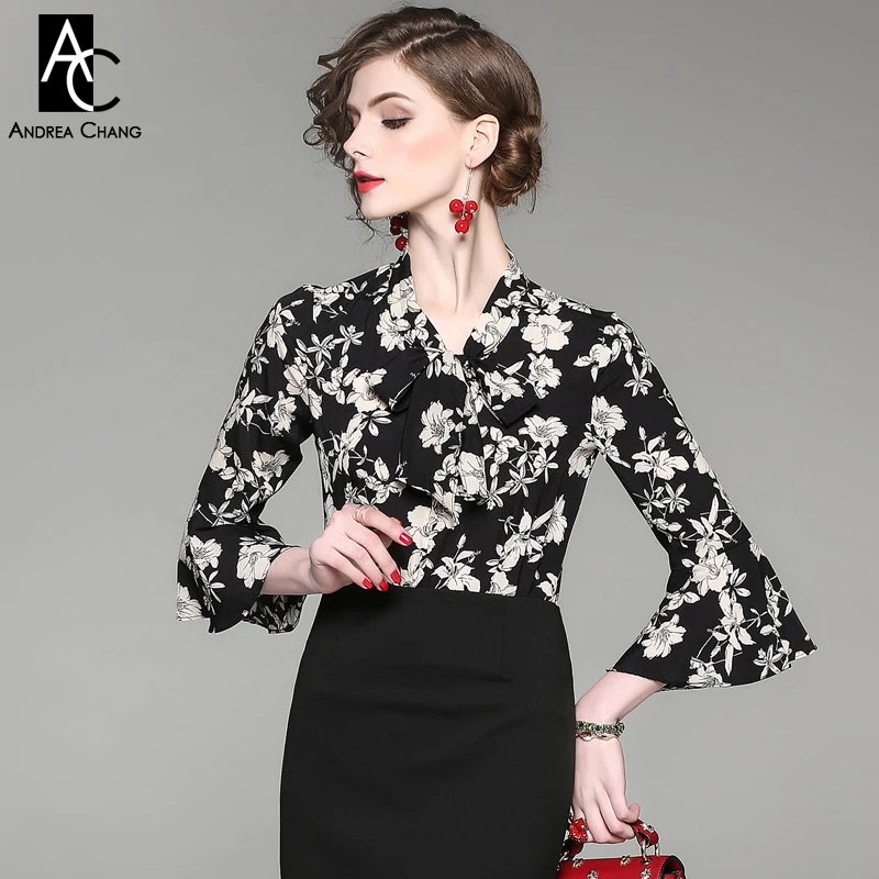 Printemps Ete Piste Designer Femme Chemises Chemisier Noir Sexy Vintage Chemisier Blanc Fleur Imprimer Flare Manches De Haute Qualite Chemise Aliexpress