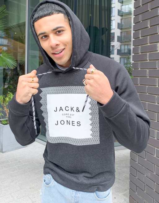 Jack Jones Box Logo Print Hoodie In Dark Gray Asos