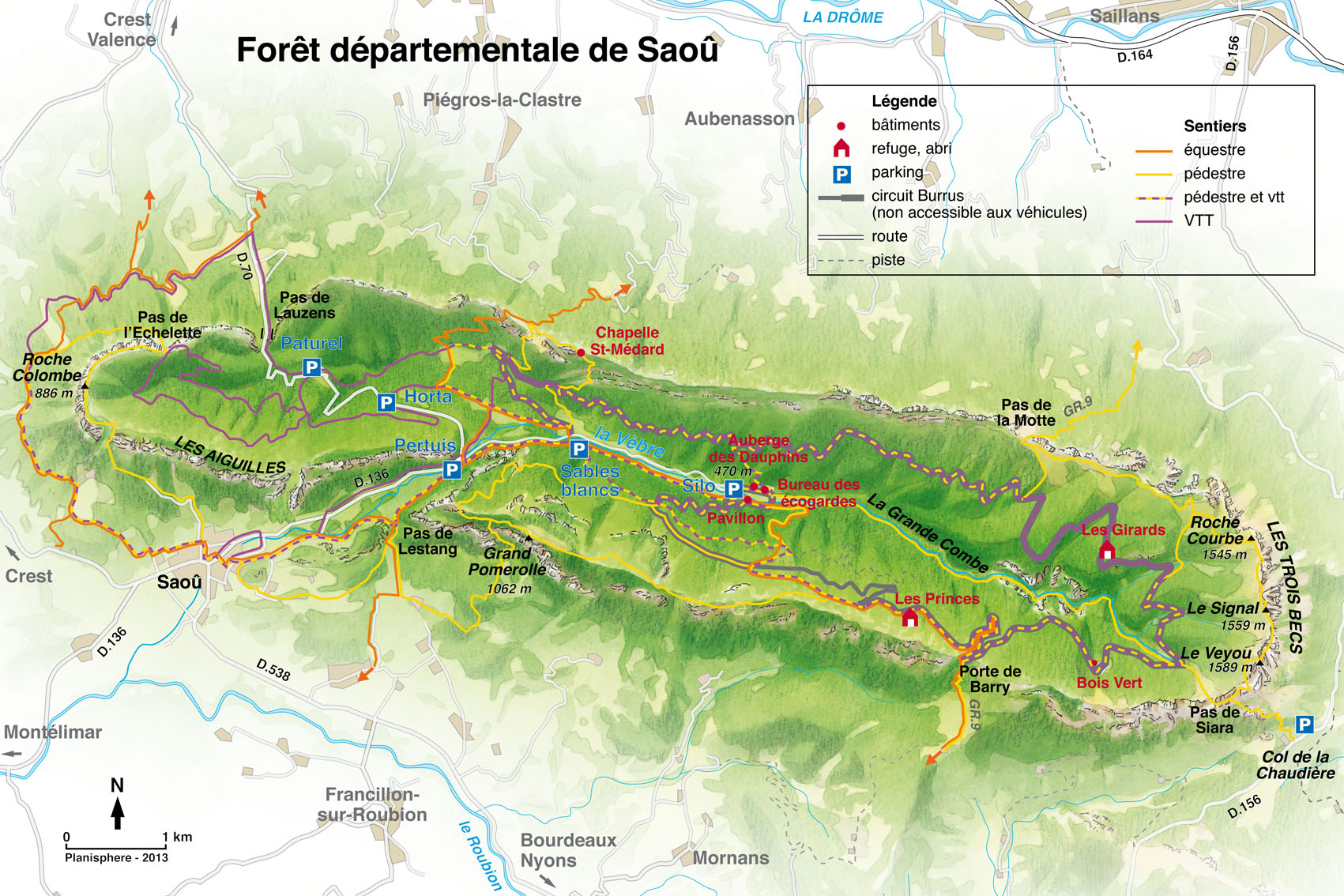 VALLÉE DE LA DrÔME Partir avec la carte IGN référencée sur ces pages est vivement conseillé Le randonneur doit être autonome, si besoin des professionnels de l’encadrement sont à sa disposition Renseignements à l’Office de Tourisme de Dieulefit/Bourdeaux wwwpaysdedieulefiteu / 04 75 46 42 49 / ot@dieulefittourismecom. Le pays de la forêt de Saoû Aux portes du village de Saoû, commence le monde d’une des plus belles forêts drômoises Ceinturé par une véritable muraille de calcaire, le massif s’étend sur 2 500 hectares et abrite une biodiversité exceptionnelle. Découvrez nos idées de randonnées près de «Saou» descriptif de l'itinéraire, photos et carte du topo.