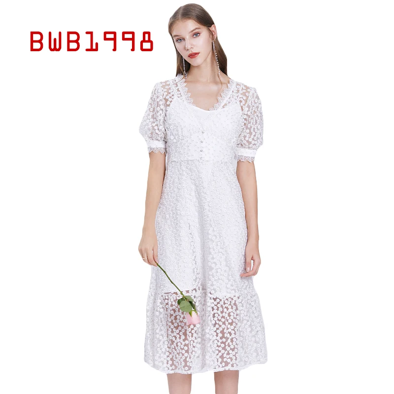 Bwb1998 Robe D Ete Broderie Col En V Temperament Taille Mi Longue Blanc A Manches Courtes Jupe Deux Pieces Robes Pour Les Femmes Aliexpress
