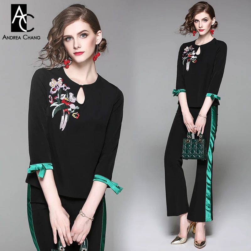 Printemps Automne Femme Outfit Noir Tailleur Pantalon Vert Ruban Arc Cote Bande Colore Fleur Broderie Poitrine De Mode Tenue Vintage Aliexpress