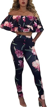 Femme 2 Parties Set Elegante Top Crop Vintage Et Pantalon Vetements De Fete Fleur Imprime Mode Party Tenue De Soiree Manches Courtes Off Shoulder Sans Ventre Haut Taille Haute Pantalons Amazon Fr Vetements