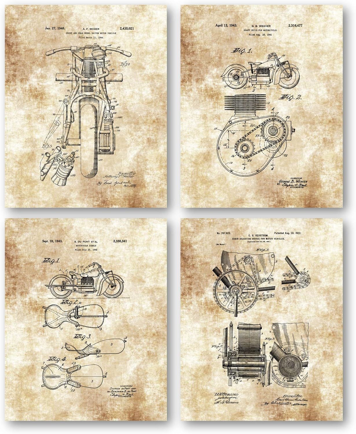 Amazon Com Original Indian Motorcycle Patent Art Prints Drawings Set Of 4 8 X 10 Unframed Prints Great Gift For Bikers Classic Indian Motorcycle Riders Owners Club Members Mancave Artwork Posters Prints