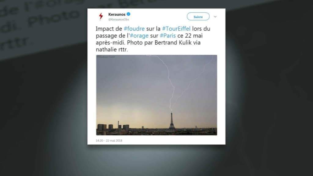 VIDÉO La foudre frappe la tour Eiffel à Paris, des coulées de boue dans l'Oise la météo était déchaînée lundi ÉCLAIR Le ciel s'est recouvert de nuages, de pluie ou d'éclair lundi. Alors que la nuit a été très orageuse du samedi 21 au dimanche 22 mai à Paris, comme dans une bonne partie de la France, la foudre s'est abattue sur la Tour Eiffel. Coup de foudre sur la Tour Eiffel samedi soir Paris, dans la nuit de samedi 21 à dimanche 22 mai La Dame de Fer a eu un beau coup de foudre capturé par un photographe amateur @Bertrand Kulik.
