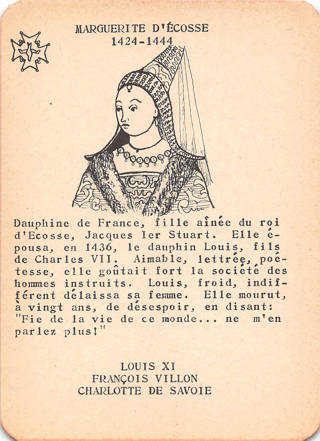 La Dauphine mélancolique (Marguerite d?Ecosse) CHAMPION, Pierre Published by Marcelle Lesage, Paris,, 1927 Soft cover Save for Later From Bouquinerie du Varis (Russy, FR, Switzerland) AbeBooks Seller Since 17 May 04 Seller Rating Quantity available 1 View all. Jan 4, 13 Margaret of Scotland (French Marguerite d'Écosse) (25 December 1424 – 16 August 1445) was a Princess of Scotland and the Dauphine of France She was the firstborn child of King James I of Scotland and Queen Joan Beaufort. Contamine, Philippe Autour de Marguerite d’Ecosse reines, princesses et dames du XVe siècle actes du colloque de Thouars, 23 et 24 mai 1997 in Etudes d’histoire médiévale (Paris H Champion, 1999) 4.