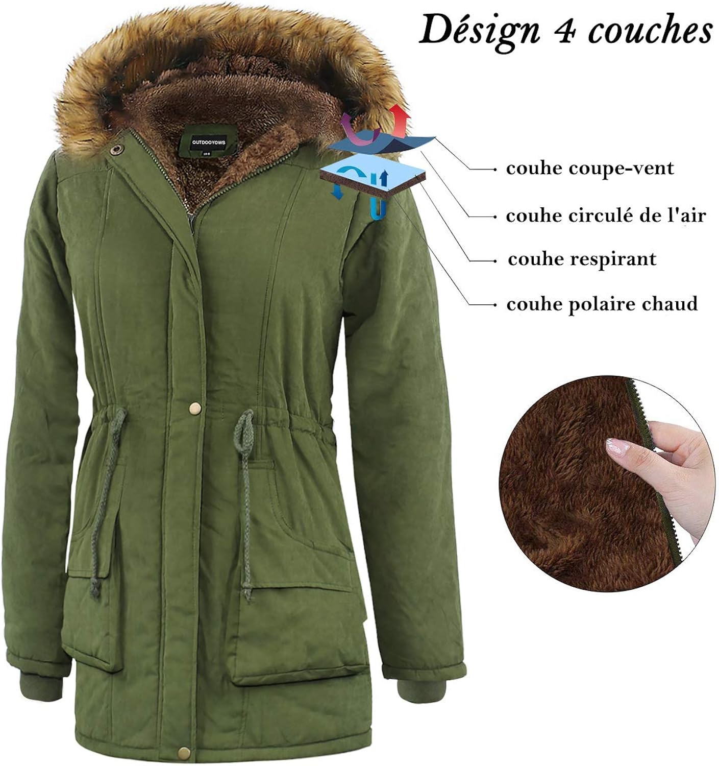 Outdooyows Manteau Femme Hiver Chaud Parka Mi Longue Double Polaire Capuche Fourrure Vetements Femme