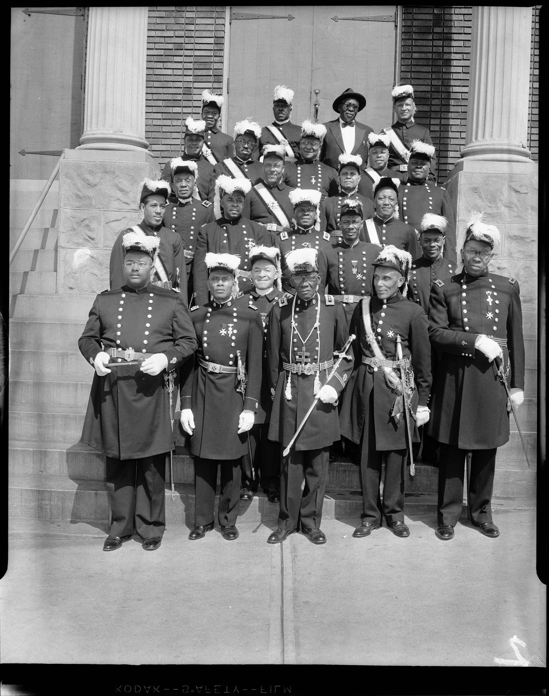 Group Portrait Of The Knights Of Columbus In Full Uniform Standing On Steps With Man Wearing Hat And Bow Tie In Back Row Cmoa Collection