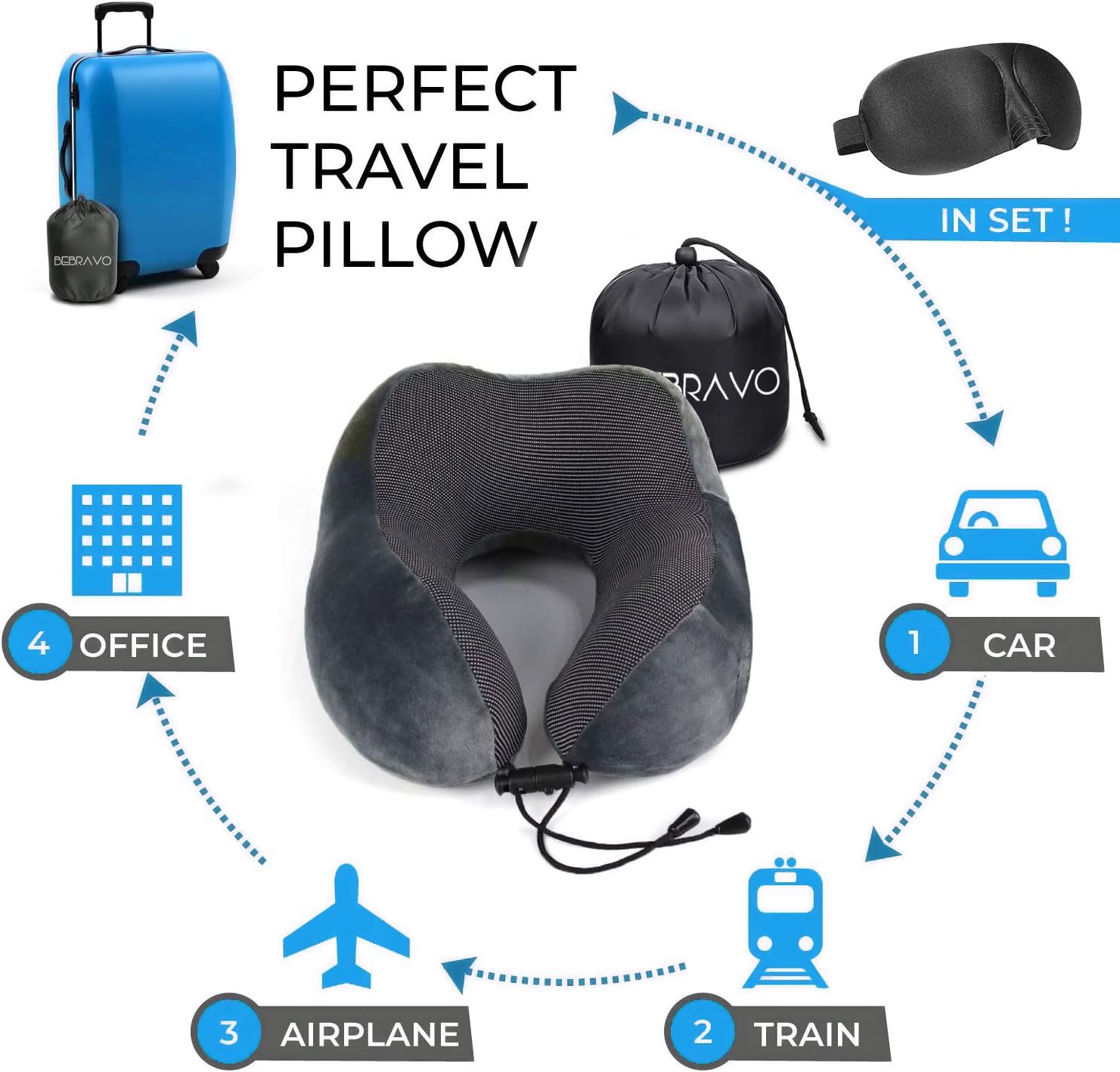 Mit Masque De Sommeil Et Sac De Transport Maison Et Bureau Oreiller De Voyage Oreiller Cervical En Mousse A Memoire De Forme Gris Voiture Pour Avion Coussin De Voyage Ergonomique Bagages Oreillers