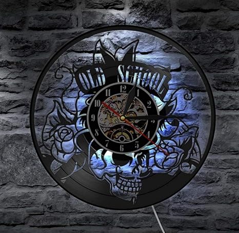 Amazon Com Qwerf Vinyl Wall Clock Traditional Skull Tattoo Cd Record Clock Vinyl Handmade Wall Art Hanging Clock Old School Tattooing Style Rose Antique Led Clock Home Kitchen