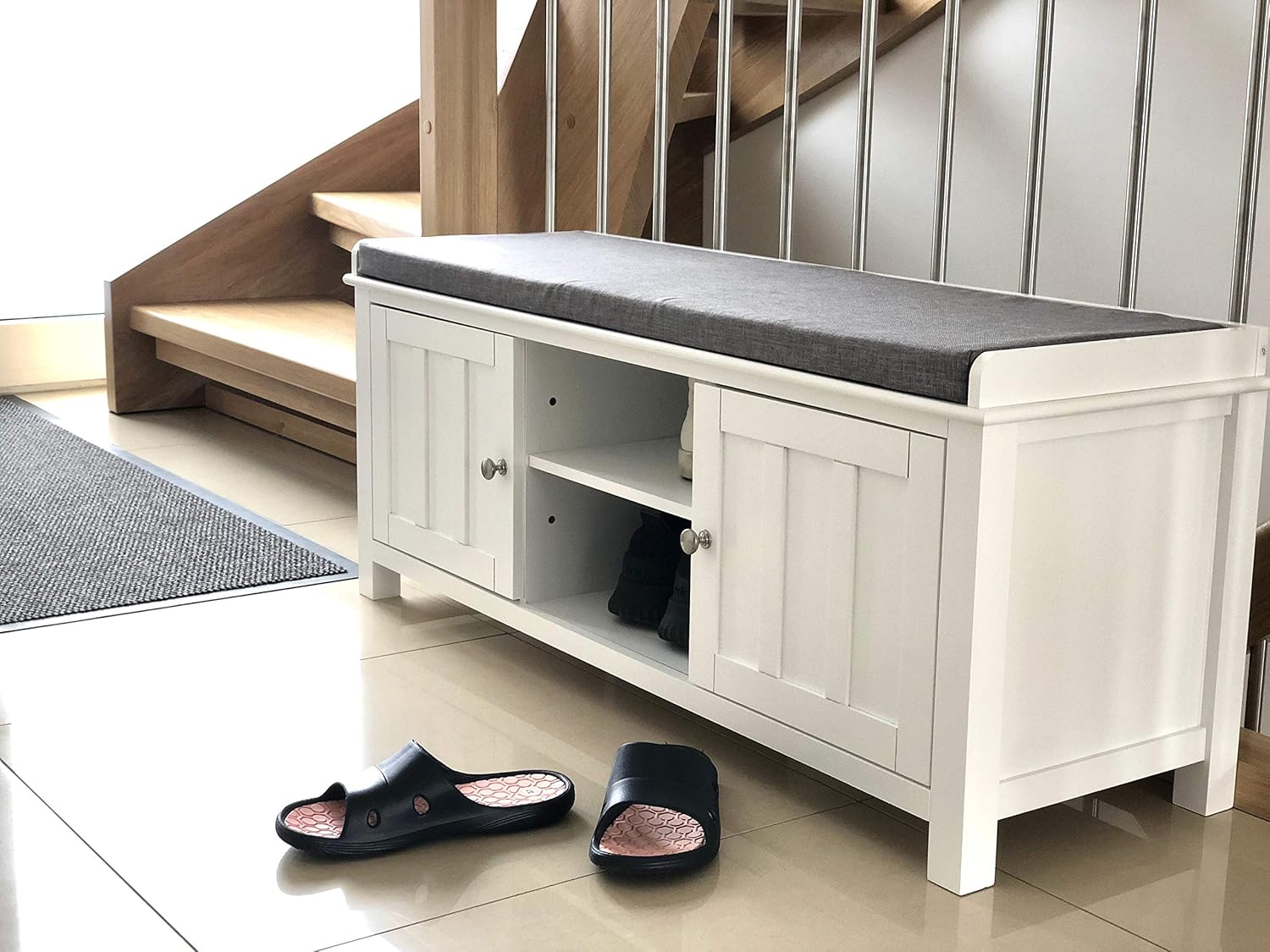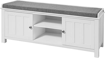 Sobuy Fsr35 W Banc De Rangement Meuble Bas Entree Commode A Bottes Chaussures Avec 2 Compartiments Ouverts 2 Portes Et Coussin Rembourre Ameublement Et Decoration Bancs De Rangement