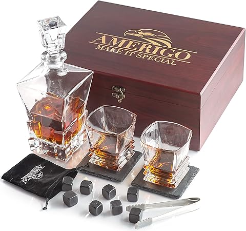 Amerigo Ensemble De Cadeaux Pierre A Whisky Carafe Whisky Coffret Cadeau Homme Cadeau Papa Coffret En Bois Artisanal Avec Un 2 Verre A Whisky 2 Sous Verres De