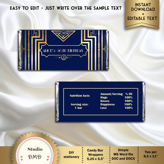 Great Gatsby Art Deco Candy Bar Wrappers Navy Blue And Gold Etsy