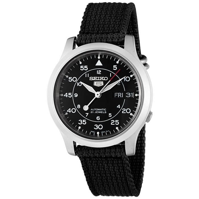 Montres homme Seiko profitez de nos sélections sur les montres Seiko homme Acier, cuir, tissu, analogique ou digitale, trouvez la meilleure montre pour votre poignet !. L'Histoire des montres de plongée L'évolution des montres de plongée Watch Studio de Shizukuishi TokinoWaza, l'artisan du temps Le musée Seiko Lien mondial avec l'IAAF Seiko et PADI® Service client Seiko 5 Sports Sports Style Seiko 5 Nos collections Seiko Watch Corporation. Case size 37 mm x 11 mm Seiko SNK809 Seiko 5 Watch The Seiko 5 Men's Automatic Black Strap Black Dial Watch is a stylish timepiece with the convenience of automatic movement A uniquely designed, black dial features white Arabic numbers marking the hours on an inner circle and the minutes on an outer circle, while small, bar indexes encircle the dial on an outside minute track.