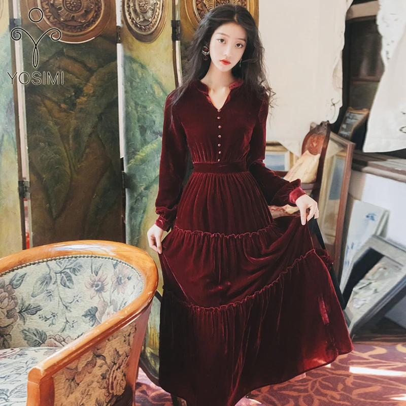 Yosimi Robe Longue Vintage A Col En V Tenue Longue En Velours Rouge Longueur Cheville Tenue De Soiree Manches Longues Automne Et Hiver Aliexpress