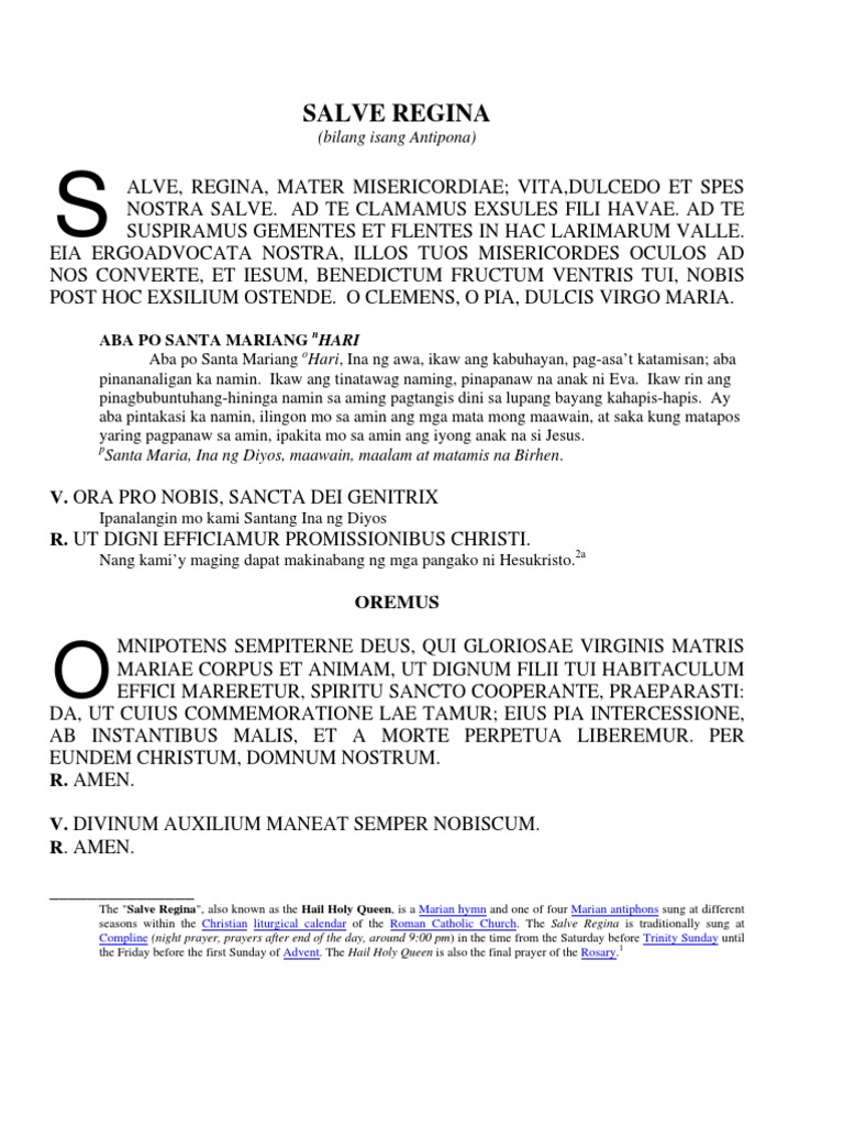 Salve Regina (Hail, Holy Queen) This is one of four Marian antiphons, with following versicles and prayers, traditionally said or sung after night prayer, immediately before going to sleep It is said from the end of Eastertide until the beginning of Advent (That is, from the day after Pentecost, the seventh Sunday after Easter (or from the following Sunday, if Pentecost is celebrated with octave), through the Friday before the fourth Sunday before Christmas). Translation of 'Salve Regina' by Christian Hymns & Songs from Latin to English Latin A A Salve Regina Salve, Regina, Mater misericordiæ, vita, dulcedo, et spes nostra, salve Ad te clamamus exsules filii Hevæ, Ad te suspiramus, gementes et flentes in hac lacrimarum valle. Latin English Salve Regina Mater misericordiae, Vita, dulcedo, et spes nostra, salve Ad te clamamus, exsules filii Hevae;.