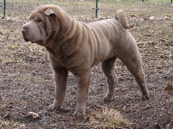 Le Shar Pei est un chien compact, robuste et solide, qui mesure entre 40 et 54 cm pour un poids compris entre 16 et kg Son poil est très court, de couleur noire, brune, beige, crème ou feu selon les chiens, et sa peau forme des plis le long de son corps, ce qui est caractéristique de cette race.
