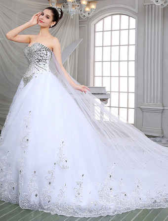 Luxe Longue Blanche Mariage 18 Lacer Tulle Bustier Appliques Dos Nu Perlage Robe Boule Robe De
