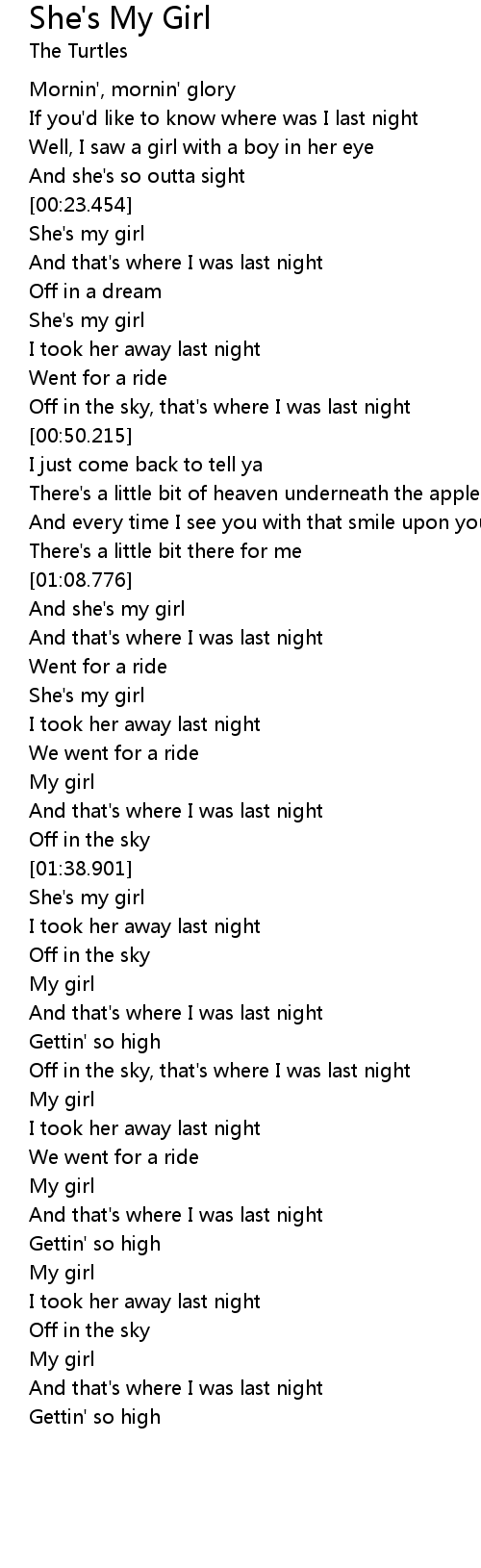 The Turtles Lyrics "She's My Girl" Mornin', mornin' glory If you'd like to know where was I last night Well, I saw a girl with a boy in her eye And she's so outta sight She's my girl And that's where I was last night Off in a dream. Finds himself in love with, or, in this case, married to, a girl, who has nothing whatsoever to recommend her I have attempted to fill this need The song is called „She's My Girl" Sharks gotta swim, and bats gotta fly I gotta love one woman till I die To Ed or Dick or Bob She may be just a slob. She wears wings that shine with golden light Her hair is fine as that of an olden wife Her eyes hold a vision of the road of life She whispers love through the winds Then rivers of love flow to my heart and my spirit ascends I grow embraced by heavenly heights Then glow rays of warmth and light I wait only for her touch of the purest.