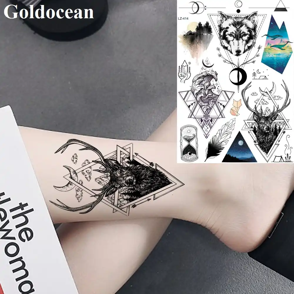 Sexy Cheville Foret Elk Bras Faux Tatouage Autocollants Geometrique Vague Lune Loup Tatto Temporaire Poitrine Grande Plume Tatouages Impermeable Bricolage Aliexpress