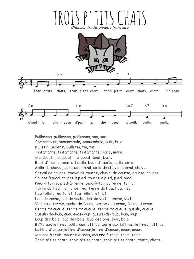 Écoute bien l'histoire plusieurs fois, et surtout regarde bien les images Demain nous jouerons avec les 3 petits chats et nous verrons si tu observes bien et si tu sais toi aussi compter jusqu'à 3 !. Trois Petits Chats Traditional French Song Lyrics and Sound Clip Lyrics Chapeau de paille, chapeau de paille Chapeau de paille, paille, paille Paillasson, paillasson Paillasson, son, son Somnambule, somnambule, Somnambule, bule, bule Bulletin, bulletin Bulletin tin, tin.
