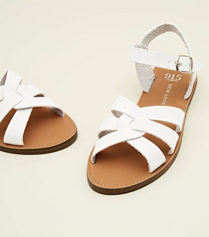 Sandales Plates Blanches En Cuir A Brides Croisees New Look