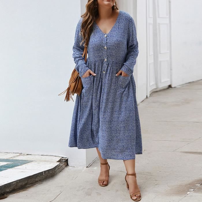 Robe Grande Taille Femmes Col En V Manches Longues Bouton D Impression Poche Plage Robe Longue Sgybuxl 365 Bleu Achat Vente Robe Cdiscount