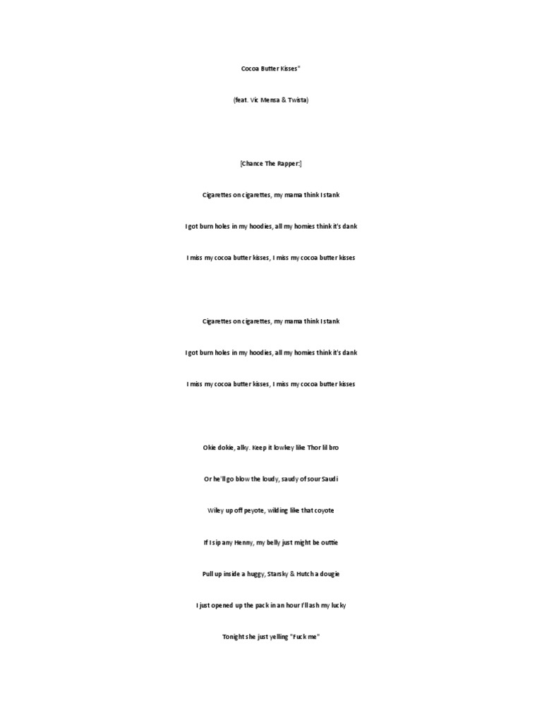Coco Butter Kisses Chance The Rapper Cigarettes On Cigarettes My Mama Think I Stank I Got Burn Holes In My Hoodies All My Homies Think It S Dank I Miss My Cocoa Butter Kisses