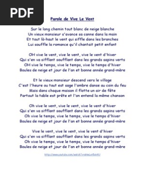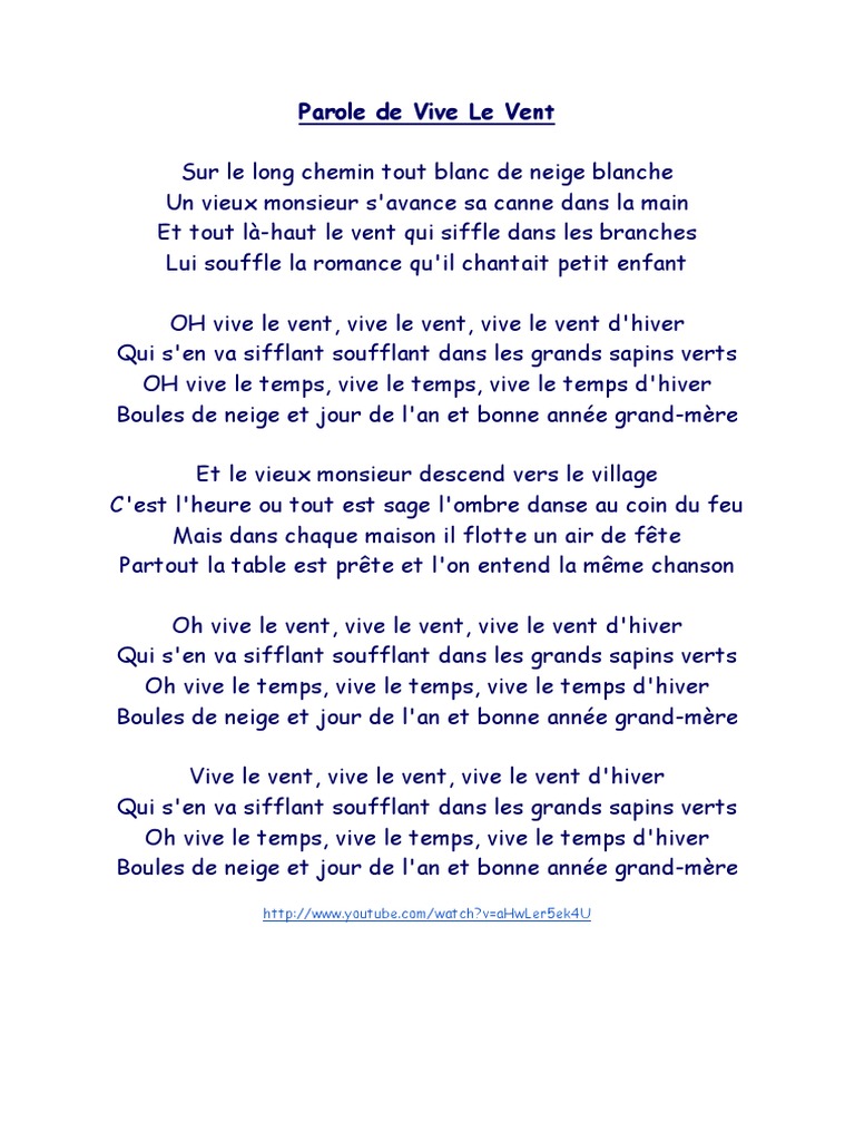 Vive le Vent fait partie des chansons classiques de Noël que nos petits lutins adorent fredonner pendant les fêtes Retrouvez les paroles de cette célèbre comptine pour enfant en vidéo, imprimez la fiche chanson ou la partition et retrouvez plein d'infos sur l'histoire de ce sublime chant de Noël. Vu sur teteamodelercom un chant de noël à reprendre en famille grâce aux paroles de vive le vent à imprimer!. Vive le vent Paroles Sur le long chemin tout blanc de neige blanche Un vieux monsieur s’avance avec sa canne dans la main Et tout làhaut le vent qui siffle dans les branches Lui souffle la romance qu’il chantait petit enfant, oh !.