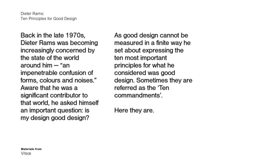 Dieter Rams 10 principles of good design (should add Good design principles sound better in German) Whether you are designing a service, a product, a power point, a website, a business plan or problem solving a challenge at work, reflect on how you might apply some of Dieter Rams 10 principles to your domain. Dieter Rams Ten principles for good design Back in the late 1970s, Dieter Rams was becoming increasingly concerned by the state of the world around him “An impenetrable confusion of forms, colours and noises”. Now Dieter Rams, the guiding force behind the Braun look, breaks down his design principles and processes in this elegant book Enumerating each of his ten principles such as good design is innovative;.