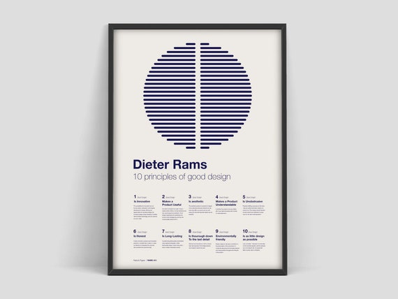 Dieter Rams 10 Principles of Good Design This list has probably been touted more than enough on the Internet and Design circles I recite Deiter Rams 10 Principles of Good Design on the small, off chance that you haven't already come across them before Even if you are familiar, it is always necessary to refamiliarise yourself from time to time. Dieter Rams was born in Wiesbaden, Germany, in 1932 He was strongly influenced by the presence of his grandfather who was a carpenter Rams’s early awards for carpentry led to him training as an architect as Germany was rebuilt in the early 1950s. Dieter Rams’ famous “10 Principles of Good Design” beautifully letterpress printed on 5" x 7" Cranes Lettra 300gsm paper Designed by Build Prints are sold unframed, and we ship worldwide Just start the checkout process and you’ll see shipping charges before you pay.