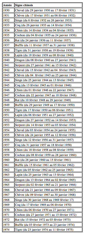 Signe chinois Pour calculer son signe astrologique chinois et son élément en fonction de la date de naissance, il est indispensable de renseigner le jour et le mois de la date anniversaire ;. An October 1970 meeting with Pakistan's ruler Yahya Khan (see document 3) had some potential for expediting contacts because Pakistan had provided a channel for earlier SinoAmerican communication in 1969 Nevertheless, as the documents show, Kissinger was also trying other channels, such as the Romanian government and an old friend, Jean. Thème astral chinois Pour connaître votre thème astral chinois il suffit de vous référencer à votre date de naissance Par exemple si vous êtes né en 1985 vous êtes du signe « buffle », si vous êtes né en 1994, vous êtes du signe « chien ».