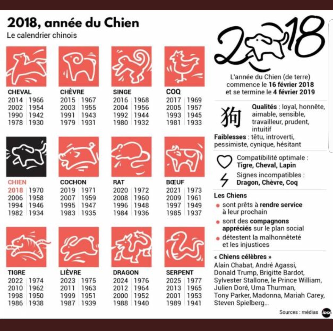 4 juil Découvrez le tableau "Signe zodiaque chinois" de Lorelei Tabut sur Voir plus d'idées sur le thème signe zodiaque chinois, zodiaque chinois, zodiaque 1958, 1970, 19, 1994, 06 ou en 18, année chinoise Tiger avatar de la tête, signe zodiaque chinois illustration, silhouette noire isolé sur blanc. On peut toujours compter sur les personnes du signe chinois du Chien En amitié, comme en amour, le Chien est fidèle et constant La passion, les sautes d’humeur, très peu pour lui. Dans le calendrier chinois, la date de changement de signe est celle du nouvel an chinois, qui commence habituellement à la fin du mois de janvier ou au début du mois de février (période comprise entre le 21 janvier et le février) Si vous êtes né au début du mois de janvier ou avant le commencement de l’année chinoise, il.