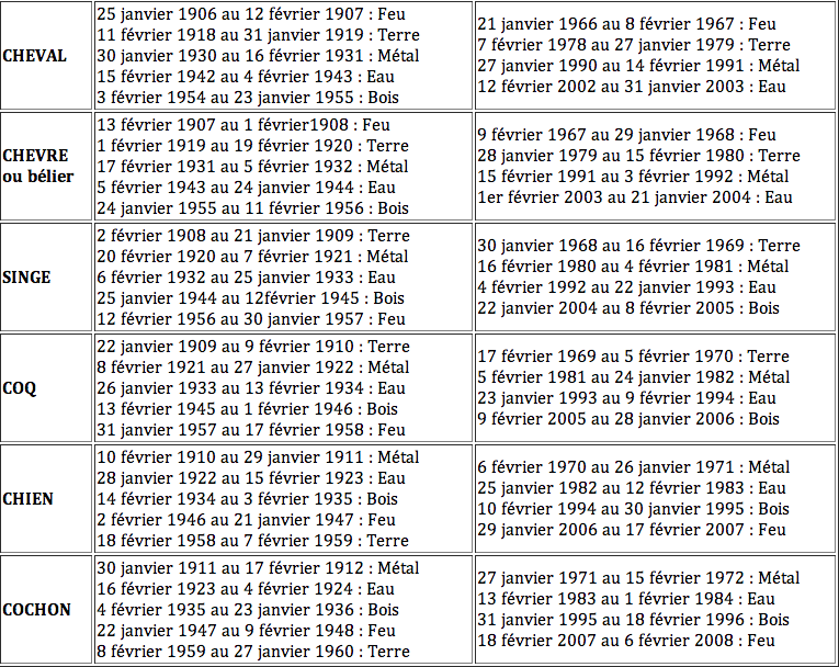 It's your Chinese year of birth that determines your Chinese animal sign as well as your Chinese cosmic element If you were born between January 21, 1966 and February 8, 1967 — that is, in the course of a Horse year, which was at the same time a Fire year — your Chinese animal sign is Horse, and your Chinese cosmic element is Fire. CHIEN Chien METAL *** Chien EAU *** 1219 Chien BOIS. 1917, 1926, 1941, 1953, 1965, 1977, 19, 01, 13 Le signe chinois du serpent est souvent de bonne humeur et a une habileté à communiquer, mais parle peuLes serpents ont énormément de sympathie pour les autres et aimeraient prendre des mesures pour aider les personnes en difficulté.