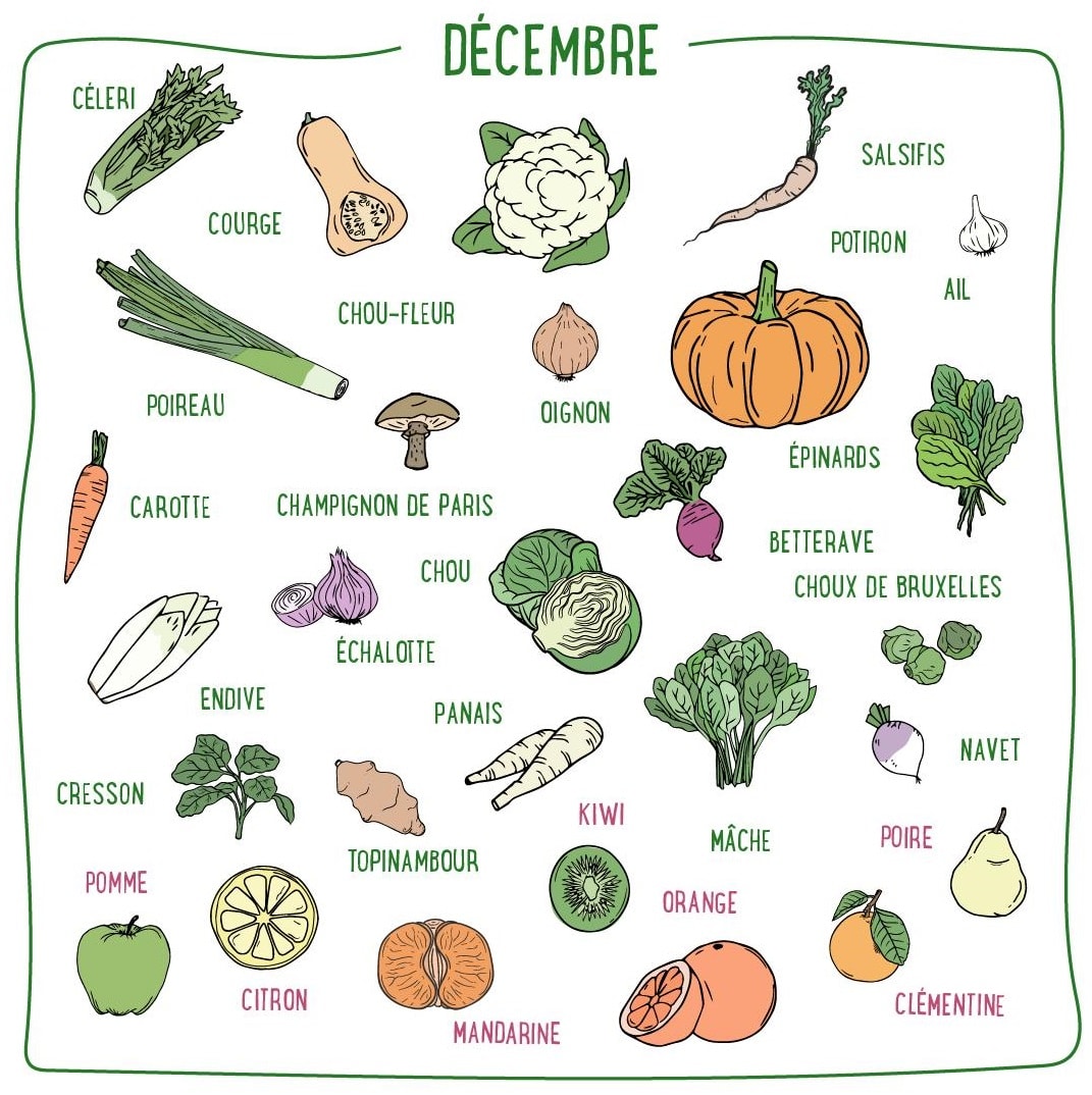 Pour faire le plein d'énergie, régalezvous de fruits et légumes de saison avec notre calendrier du mois de décembre à télécharger !. Le mois de décembre marque le début de l’hiver et qui dit hiver dit besoin de vitamines et de minéraux pour préparer l’organisme à affronter le froid !. Posté le 1 décembre 18 Laisser une réponse Les premières gelées figent le potager et les nuits sont froides C’est la saison de légumes racines, des choux et des agrumes venus des pays chauds Légumes betterave.