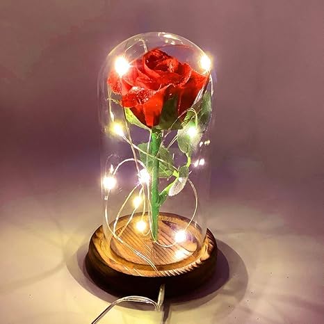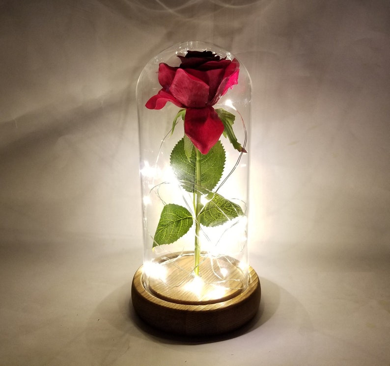 Amazon Com Shirylzee Enchanted Rose Beauty And The Beast Glass Rose On Wooden Base Led Light Artificial Flower Home Decor Valentine S Mother S Day Wedding Birthday Best Romantic Gifts Kitchen Dining